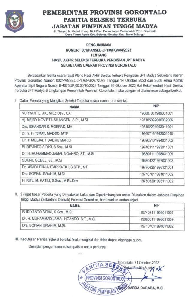 Berdasarkan berita acara rapat pleno hasil akhir seleksi terbuka pengisian JPT Madya Sekertaris Daerah Provinsi Gorontalo Nomor : 002/PANSEL-JPTM/PG/X/7/2023 Tanggal 14 Oktober 2023 dan Surat Ketua Komisi Aparatur Sipil Negara Nomor B-4075/JP.00.00/10/2023 Tanggal 26 Oktober 2023 Hal Rekomendasi Hasil Seleksi menetapkan tiga besar peserta yang dinyatakan lulus yaitu :
